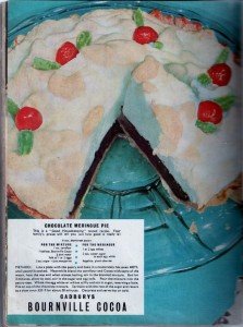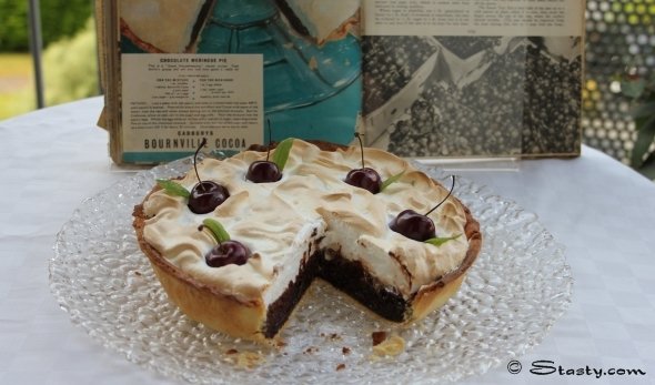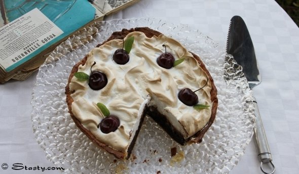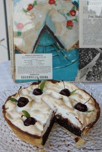 So, I finally dusted down the old recipe book, donned my 1950’s style apron, put on some Frank Sinatra and began my journey back in time. Wouldn’t this dish look very impressive at a dinner party in the 1950’s? I chose this particular recipe for Chocolate Meringue Tart, because it looked so decadent and delicious. I was also kind of intrigued by the concept. Chocolate, meringue and pastry, I wasn’t too sure if it would turn out to be yucky or yummy. As I read the recipe I realised I would have to change a few little things. I just couldn’t bring myself to use margarine, so I used lovely Irish butter instead. And that chocolate filling looked a little bland, so I jazzed it up with some Cointreau. I also used real cherries on top instead of sticky glace ones and garnished with some fresh fragrant mint. The rest of the recipe is pretty much as is and I even used Bourneville chocolate.