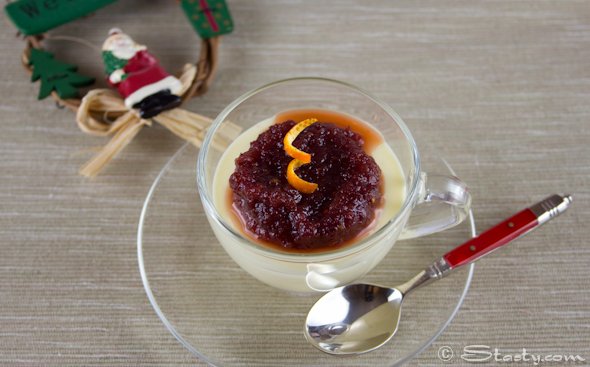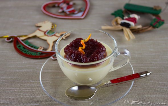 Soak the cranberries, orange juice, zest and brandy for a few hours or preferably overnight. Once ready, blitz in the food processor until it becomes a puree. Serve the panna cotta straight from the fridge with a small spoonful of the compote on top. I garnished with a thin twirl of orange peel.