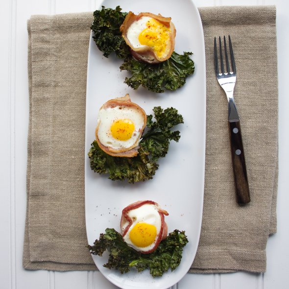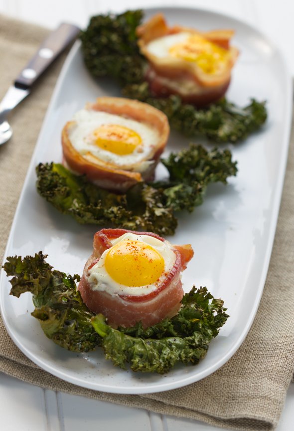 The OH jokingly said he is going to open up a restaurant called Fad. The idea of this fantasy restaurant is that it serves only the latest food fads – whether it is macaroons, bacon, kale, cupcakes or cake pops! He could be onto something 🙂 people become obsessed by food fads. When I was living in Ireland I was aware that kale was pretty popular among food bloggers in America. I didn’t really realize the extent until I got here. When we go for brunch, no matter where we go (Portland, Vancouver, Seattle) the first thing you smell when you walk in the door is kale! It’s taken over! In Ireland kale, is something that was threatened as a form of punishment when we were kids. Curly kale was a dirty word in our house. It was smelly, old fashioned Irish cabbage that everyone hated. However, now I am a bit older and a little wiser, I decided to jump on the bandwagon and give kale a second chance. To my surprise, it tasted great, and the other day I even began to crave it. So, I bought a big curly head of kale and made some delicious kale chips. For this particular recipe, I went all out and have surrendered to every food fad going – cooking in a muffin tin, kale and the ultimate food fad – bacon. Before you knock it though, try it! It’s a pretty fantastic brunch, and now I can see why this kale trend has lasted so long….Now I just need to convince the OH to start eating kale.