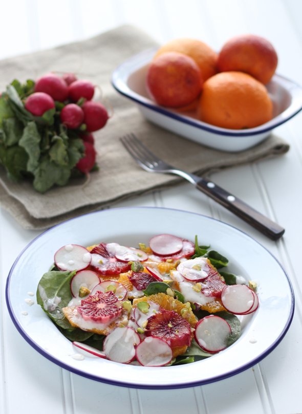 I love blood oranges – they look so dramatic when you cut through the flesh. It’s like an orange with added drama. You rarely see them though, so whenever I do, I always have to buy at least one. Usually I just eat them as they are. However, this week when my veggie box arrived I found some delicious friends for my blood oranges -soft green spinach and perfectly pink radishes. So, I whipped up this simple salad to enjoy on a beautiful sunny spring evening in Seattle. This salad is a riot of color and tastes really citrusy and refreshing. The yogurt dressing is delicious with the sweet blood oranges and the peppery radish. The pistachios add a sweet and salty crunch. It’s a great appetizer and a delicious supper to enjoy on a sunny afternoon.