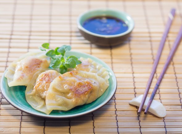 We often order gyozas when we eat out – they’re so tasty and always leave you wanting more. I’ve never attempted to make them at home though. All those delicately folded pleats always seemed like a lot of work. But, I got some gyoza wrappers recently and I was intent on learning the art of folding gyoza. It turns out its pretty simple, though it does require a bit of patience…and maybe small hands 🙂 I made a simple ginger and chicken filling with a little cabbage, carrot and soy sauce. I served them with a ginger and soy dipping sauce -they were delicious. We devoured them straight away, and I just managed to keep a few behind for the photo . Here in America, gyozas are sometimes called potstickers, as they have a tendency to stick to the pot. I used a great non-stick skillet though, and had no problems with them sticking to the pot. I can’t wait to make gyozas again, and looking forward to experimenting with lots of different filings.