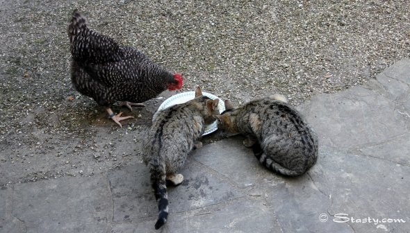 The lone hen is still giving us an egg a day but she is looking a bit lost without her hen friends. So much so that she has even started to hang out with the cats. Whenever we feed the animals, the hen ignores her own plate and runs jauntily down the steps to come dine with the cats. Needless to say the cats are a little confused about their new companion, but have slowly come to accept her. I think if we don’t get her some new hen mates soon, she might start to meow.