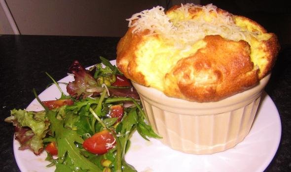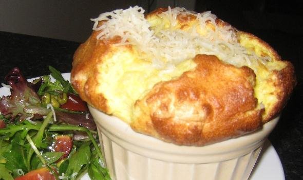 Pop the mixture into your prepared ramekin dishes.  Place in the oven for 20-30 minutes. You will really have to call this yourself.  They  should be golden brown and well well risen when they are done. Sprinkle with some of the remainder of the freshly grated parmesan,  Eat them as soon as they come out of the oven as they will flop rather spectacularly in seconds! However, for that 5 seconds they are really impressive and taste deliciously light and cheesy.