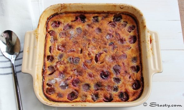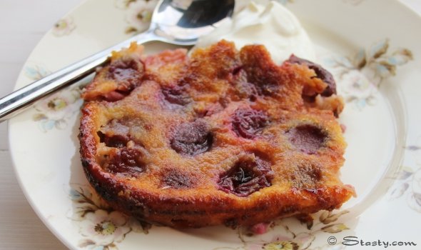 I had been yearning for a new cookbook recently and out of the blue I had a visit from the Fairyhobmother who bestowed me with an Amazon voucher to buy one. Thanks to the delightful David from Appliances Online I was able to order Kitchen Secrets by Raymond Blanc which arrived in the mail and brightened up my miserable old Monday morning. I was even more excited when I opened the book and landed on a recipe for cherry clafoutis. It’s a dish that I love and one that evokes so many good memories of summertime in France. The family I stayed with during a French exchange had cherry clafoutis every week and it’s a taste that I always associate with summer and good times. Cherry clafoutis is essentially a sweet batter with macerated cherries and encrusted with sugar. Simple, but extremely moreish. I made this dish on Monday night, but it was too hot to eat when I was going to bed. It looked so amazingly tempting when I woke up the next morning that I had it for breakfast with just a small dollop of crème fraiche. It makes for a delicious if not boldly decadent summer breakfast as well as being a great desert.