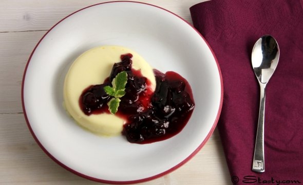 When you are ready to serve and the panna cotta is set, remove from the fridge. Place the bottom of the mould in a bowl of boiling water for just a few brief seconds. Dip a sharp knife into the boiling water. Trace the edges of the panna cotta with the sharp knife and remove by up-ending the ramekin onto a plate. Place a small spoonful of the compote on the side. If you don’t like cherries, you could equally serve this dessert with rhubarb, strawberry, apricot, blackcurrant and lots of other compotes.
