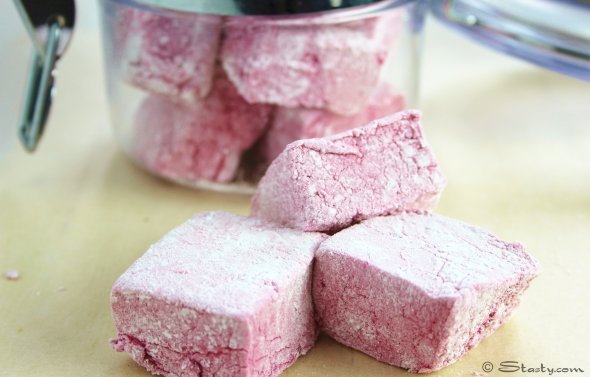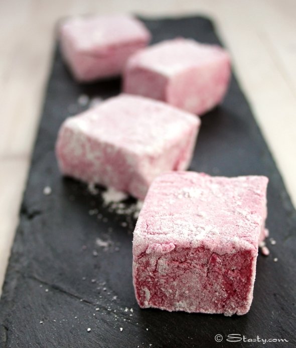 There is something very childishly satisfying about making massive quantities of this bright sticky pink glue like substance. As you beat it, it becomes stickier and thicker until you can’t help but stare at it in wonder. Pouring the pink glob into a tin was a little precarious. This really is a job where a helper / adult supervision:) is required, or else you could end up in a very pink and sticky mess. After patiently waiting for the pink glob to set, it was now time to release my pink jewels imprisoned in their metal tin. However, the marshmallow was stuck tight to the tin and had to be almost suctioned out. The recipe gave some advice about using a sharp knife, however I ended up literally prising it out with my hands dusted with icing sugar. It landed on my chopping board with a satisfying wobble! I sliced them up into neat little cubes and dusted liberally with more icing sugar. Viola…wobbly mallows.