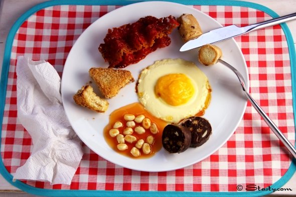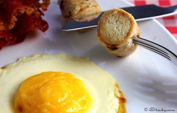 Thanks so much for all your lovely comments and great guesses. Today I’ll reveal how I made that golden sausage, that gooey egg, sunny side up and that pesky streaky bacon. The egg and sausage were fine, but that streaky bacon had me stumped. I was almost going to leave it out altogether. When I finally came up with the brandy snap bacon, I knew I had it. Though not an absolute likeness (due to the holes!) it looked realistic enough for me, the texture was good and the taste was great.