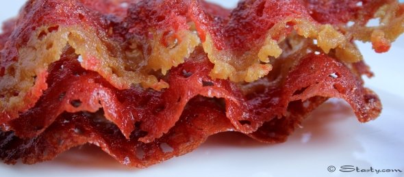 Ok, so they may be a bit holey, but this is the closest I could get to making sweet streaky bacon. They are made of sweet brandy snaps. I tried a number of different approaches from jellies to toffees but this was the best. Half the mixture was coloured with red food colouring and the rest of the mixture was left natural.