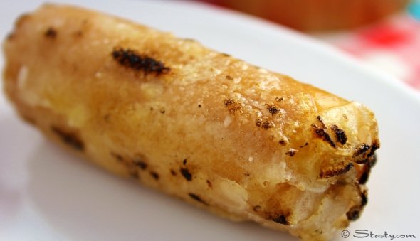 The sausage was simply some sponge cake, cut into a sausage shape. I then rolled it in smooth peanut butter, before rolling in a sheet of rice paper. To get that crispy skin, I covered the rice paper with icing sugar and used a blowtorch to caramelize it until brown and sizzling. Sugared toasted rice paper is surprisingly delicious! The texture was sweet and crispy with lovely peanut butter sponge underneath.