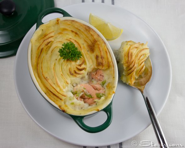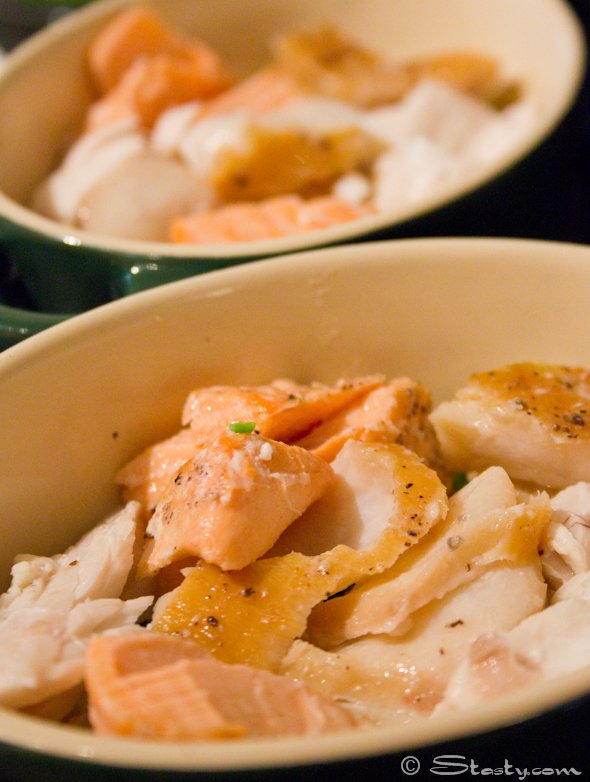 Now that the fish has cooled, remove the skin and all the bones. It’s a pretty tedious job, but it’s worth it, as you don’t want your guests to choke! Break the fish into chunky bite size piece and arrange over the crushed pea layer. Mix up the different fish pieces so that each serving will give you a different selection of fish. Pour the white sauce over the fish.