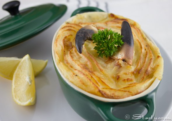 For the final layer, you can either pipe the mashed potato with a piping bag or simply spoon it on. If you do spoon it on, it’s a good idea to drag a fork over the potato to give an uneven surface, as this will ensure a crispy topping. For that extra bit of decoration and decadence, I placed two ready-cooked crab claws into the centre of the potato.