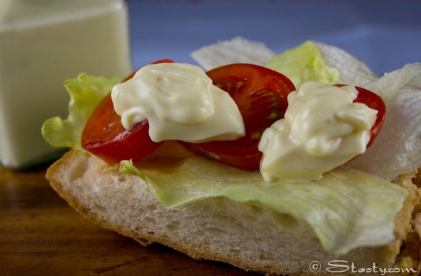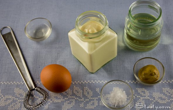 Place the egg, mustard, vinegar, and salt in a food processor and power the mixer on at medium speed. While the machine is still working, slowly trickle the vegetable oil into the mixture until all the oil is added. You should now have a thick white mayonnaise. You can also make it by hand if you don’t have a food processor. Place the egg, mustard, vinegar, and salt in a medium sized bowl. Whisk together and as you are whisking slowly dribble the oil into the bowl. The only way you could mess this recipe is up is by adding in all the oil too quickly and the mayo will split. So, make sure all the oil is incorporated first before adding the next drop of oil. It takes a while and you may have a sore arm by the time you are finished, but the process is the same.