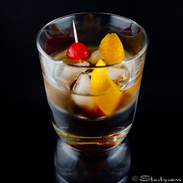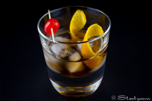 Remove the pith from the orange peel and gently squeeze over the glass to release the oils from the peel. If you want to be a bit flash, squeeze the peel into the glass over the flame from a lighter for that burnt orange aroma. Drop the peel into the glass and add the cherry.