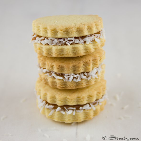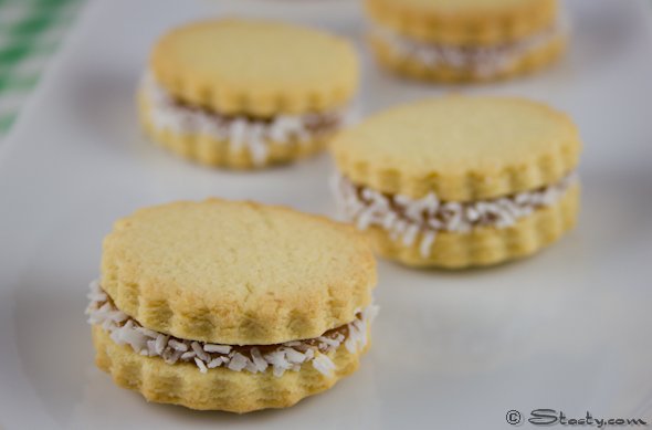 I’ve made a few different types of biscuits before, but like everyone else I’m always looking for something new. Then I discovered Alfajores in a local Argentinean café and it was love at first bite. Alfajores (pronounced alfa-HOAR-ays) are popular cookies in many Latin American countries especially at Christmas time. There are loads of different familial and regional versions of Alfajores, but this version with dulce de leche and coconut is my personal favourite. The biscuits are so small, light and crumbly and they are so much nicer than a heavy mince pie. They can be made in different sizes, but I like them no bigger than an espresso cup. They’re crumbly and delicate and are the perfect complement to a rich, dark cup of coffee. I always try out a new batch on my work colleagues (and the OH’s colleagues) and these were especially popular – that’s always a good sign. They’re simple to make and I guarantee people will be asking for more.