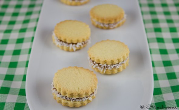 Once the biscuits have fully cooled, gently spoon a small teaspoon of Dulce de Leche on the flat side of the cookie and sandwich with the other half of the cookie. Place the desiccated coconut in a large pile on a baking sheet. Make a well in the centre of the coconut and place the biscuit in the centre. Gently push the coconut onto the sides of the cookie, so that it sticks to the Dulce de leche. Once the biscuit is coated with the coconut, remove and place on a serving plate. These biscuits keep for about 2 days in a sealed airtight tin.