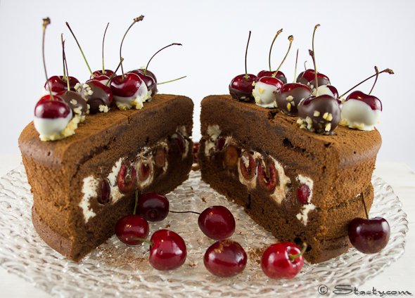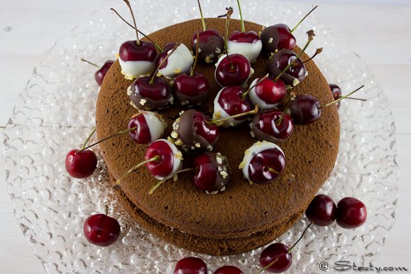 Next, whip the cream and add the brandy to flavour the cream. Place the cream in one piping back with a medium sized nozzle and the chocolate ganache in another piping bag, also with a medium sized nozzle. Have the pitted cherries ready for the assembly.