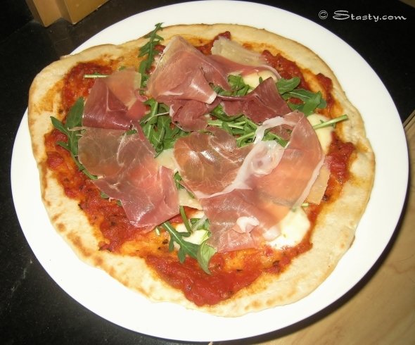 Once the cheese starts to bubble, take out from underneath the grill. Add the rocket, basil, shaved parmesan, ham…whatever topping you like. Eat straight away, while hot and crispy.