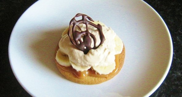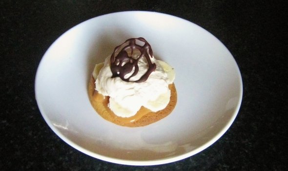 To assemble, place the biscuit on the plate. Smear on some toffee sauce. Place some sliced banana on top. Spoon over a couple of dollops of coffee cream and adorn with your amazing chocolate decorations.