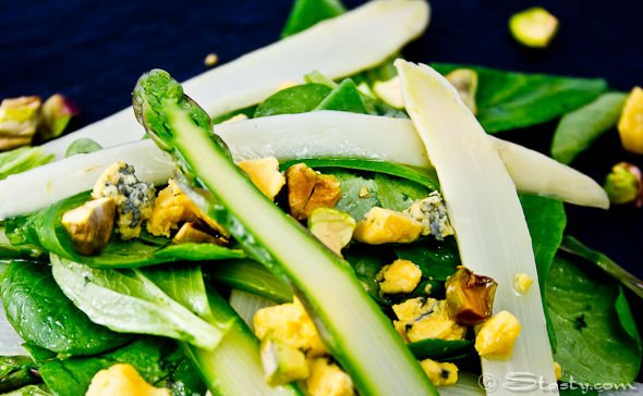As soon as you are ready to serve, shake the dressing up again to make sure it is fully emulsified. Dress the leaves with the dressing. Add the asparagus ribbons and gently mix in with the lettuce. Crumble the blue cheese on top and garnish with the pistachio nuts. Serve straight away.