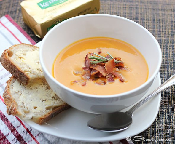 Begin by melting some butter and a splash of olive oil in a large heavy bottomed saucepan. Add the onions and heat over a medium heat until translucent and almost golden. Add the garlic and cook for a further few seconds. Next, add the wine and cook it for another 5 minutes. Then add the chopped butternut squash. Cook for 5 minute and then add the chicken stock. Place the lid on the saucepan and allow to cook over a medium heat for about 20 minutes. At this stage the butternut squash should break apart when pushed against the side of the saucepan with a spoon. Add the chili and season with salt and pepper. Place the soup in a blender and blitz until smooth and creamy. Next, pour back into the saucepan add the milk and heat over a gentle heat. Taste and adjust the seasoning if necessary. Sprinkle with streaky bacon bits and serve with some warm, crusty bread, preferably slathered with Irish Kerrygold butter.