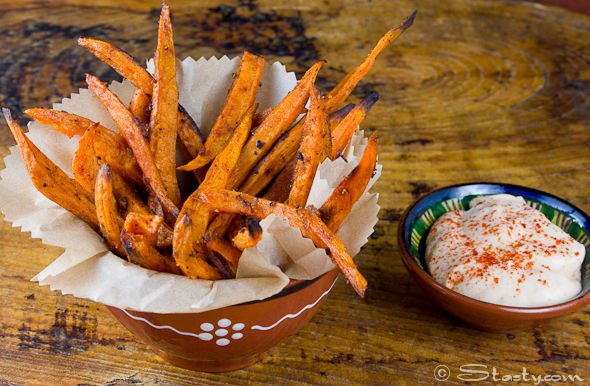 Leave the sweet potato fries in the oven for about 10 minutes, and then toss them around, so that they are evenly cooked on both sides. They should only take about 20 minutes to cook. Meanwhile to make the spicy sour cream, use the bowl with the residue of spiced olive oil. Add the sour cream to the bowl a long with the chipotle sauce. The spices will mingle together with the sour cream. Taste and then season with salt and pepper. Serve in a small dish with some paprika sprinkled on top.