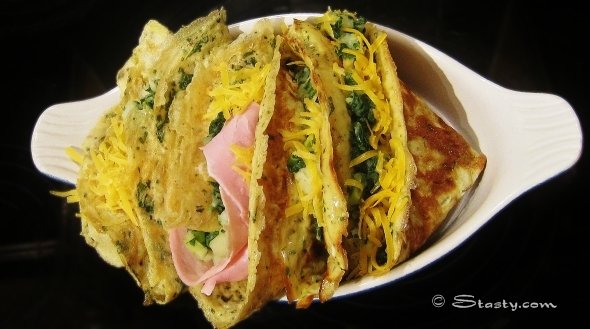 This recipe is kind of a combination of an omelette, a pancake and a quesadilla. It’s a really nice tasty snack and you can fill the omelettes with whatever cheese, meat, veg you have leftover in your fridge. It would also work really well with something like a smoked salmon, crème fraiche and spinach filling. This is a great brunch or tea-time treat.