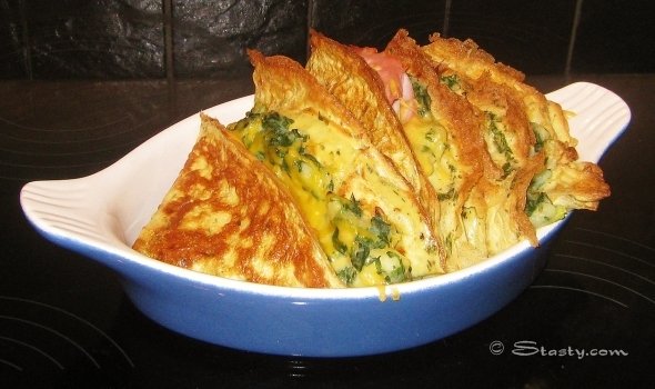To complete this dish, fill the pancakes with whatever mix you like. Fold in half and then in quarter. If you want to make these omelettes extra crispy, place under the grill for five minutes.