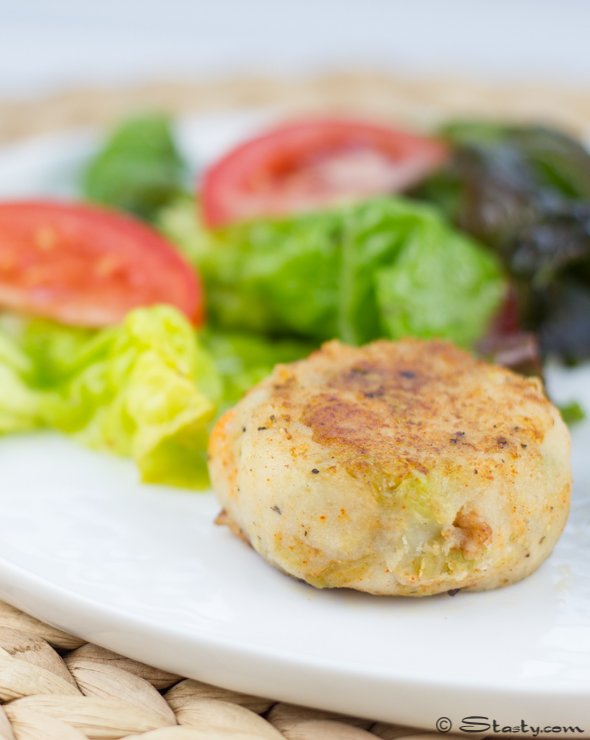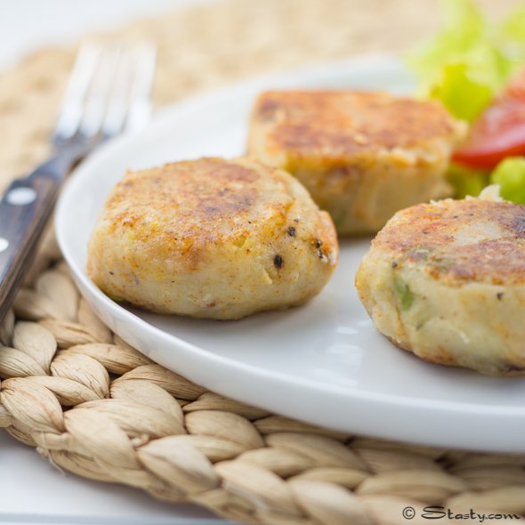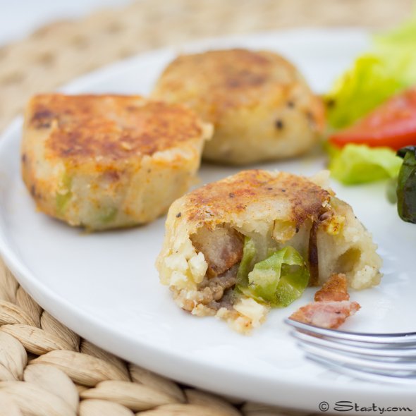 I have actually been craving this dish, but it seemed like a lot of effort, and I am having a really hard time finding smaller cuts of bacon here. So, I had some left over mashed potatoes, to which I added some crispy bacon and tender shredded cabbage. I formed this into delicious little cakes, and fried until golden. The OH hates cabbage, but devoured these up without even noticing. These tasty cakes make a great supper and a nice alternative to the bland potato cake.