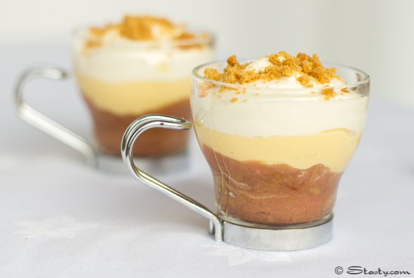 I am back home in Ireland at the moment, where it has been unseasonably cold and snowy. Despite the bad weather, there is still some hardy rhubarb growing in the garden surviving against all the odds. I love the taste of sweet and tart rhubarb, especially with some creamy home-made custard. I decided to make a mini trifle with these two elements and topped with cream and ginger biscuits. These mini trifles are an elegant and a light alternative to a big heavy trifle. The ginger biscuit crumbs add a satisfying crunch and the cream makes the traditional rhubarb and custard combination a little more indulgent. So, if you are looking for a nice simple and seasonal dessert this Easter, this a perfect one to try.