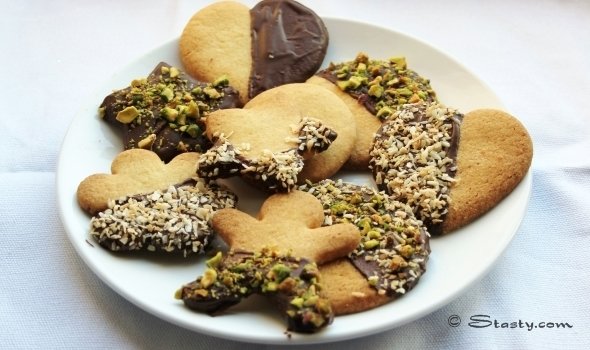 To decorate, melt some chocolate in a  bowl over a saucepan of boiling water. Place some chopped nuts and coconut in a  frying and heat until lightly toasted. Dip the cooled biscuits into the melted chocolate until they are half covered. Then dip the biscuits into the toasted nuts and coconut. Leave to set on a wire rack.