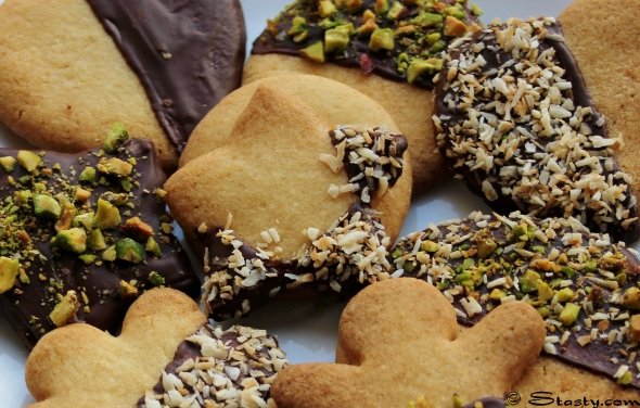 Sometimes I feel like a little homemade treat, and these biscuits always hit the spot. Sable biscuits take a bit of time to make, but are definitely worth the effort. They are feather light, buttery and perfectly crisp. I use this recipe a lot and you can create so many different biscuit flavours and shapes with it. I sometimes cover sables with lemon curd and a swirl of meringue on top, sort of a miniature lemon meringue biscuit. I also used them in this recipe to create mini banoffee pies. On this occasion, I cut them in different shapes and dipped them in melted chocolate with a light sprinkling of toasted nuts and desiccated coconut. If this recipe seems like just a bit too much work, check out my friend Caitriona’s review of  a small Irish company, Kooky Dough, that produce readymade cookie dough, which might just save you in a biscuit emergency.